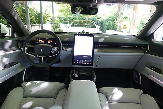 인테리어도 레이아웃은 폴스타2와 다르지 않지만 스티어링 휠 앞쪽의 10.2인치 디스플레이로 인해 이미지가 제법 달라 보인다. 대시보드 가운데에 세로형 디스플레이 창으로 거의 모든 기능을 수행한다. 아직은 그런 전자기기 타입의 작동에 대해 모든 소비자의 피드백이 종합되지는 않았다. 기존 차에 익숙한 사용자들은 처음에는 어색할 수 있겠지만 스마트폰 사용으로 인해 어렵지는 않다. 안드로이드 오토모티브 드라이브 OS가 기본이다. 중앙 집중식 컴퓨팅은 엔비디아제를 사용한다.