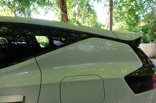 측면에서는 뒤쪽으로 흘러내리는 루프라인이 중심이다. 맨 끝부분에 에어 스포일러를 설계하고 있는데 기능성과 예술성을 동시에 구현하는 타입이다. 그것이 좁은 그린하우스와 함께 어울려 역동성을 살려내고 있다. 문법이 내연기관의 그것과 크게 다르지 않지만 제법 화려하게 느껴진다. SUV임을 강조하는 크로스오버이지만 도심형 이미지와 절묘하게 조화를 이루고 있다. 그것은 21인치와 22인치 휠과 조합해 당당한 자세를 만들고 있다. 브렘보제 4피스톤 브레이크의 황금색 캘리퍼도 엑센트로 작용하고 있다.
