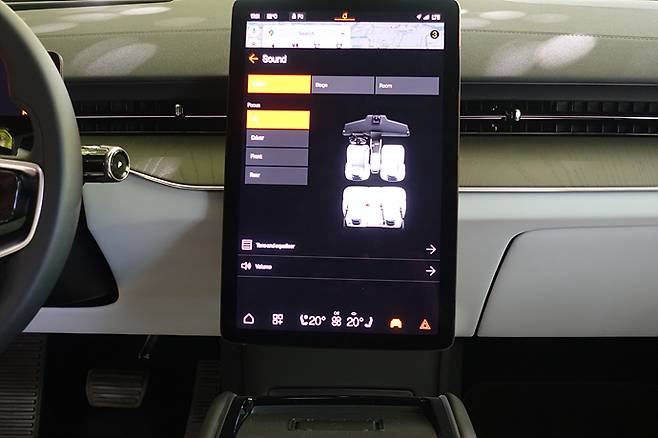이는 다른 버튼과 스위치를 최소화하고자 하는 것이다. 그런 만큼 디스플레이창의 그래픽에 많은 신경을 쓴 듯하다. 테슬라는 글자로만 대부분의 기능을 표현하고 있지만 폴스타는 다양한 그래픽과 컬러로 새로움을 주고 있다. 홈 화면의 사용은 위쪽에 내비게이션이 중심이다. 구글 플레이등 빌트인 구글을 사용하고 있지만 한국 시장에는 T맵을 적용한다. 그 아래에는 운전자가 설정하는 내용을 표시할 수 있다. 맨 아래 공조 시스템 등 자주 사용하는 앱을 정리하고 있다.