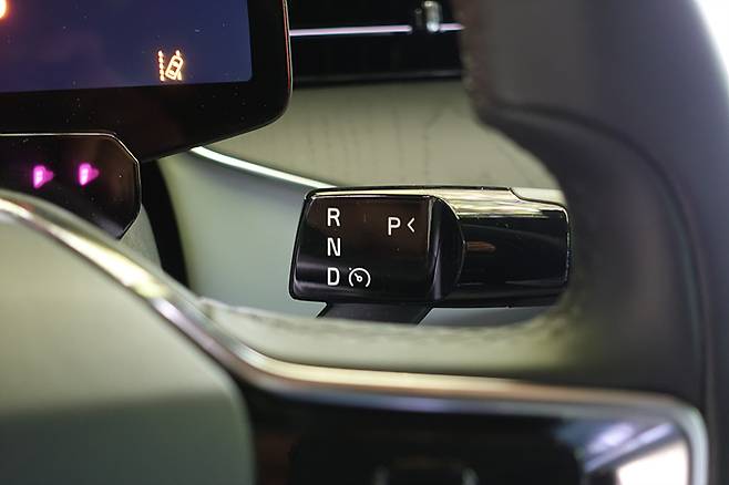 변속기는 칼럼 타입이다. 이는 간단하게 당겨 작동시키는 폴스타2의 레버 타입과 달리 내연기관차 감각을 살린 것이다. 사용자의 피드백이 있었던 듯싶다. 스티어링 좌우의 레버에 와이퍼 기능 표시가 없지만 왼쪽 스토크 바깥쪽 끝을 눌러 작용할 수 있다. 여기에서도 미니멀리즘이 적용되어 있다. 처음 접하면 당황할 수 있지만 의외로 간단하게 익숙해질 수 있다.