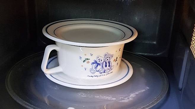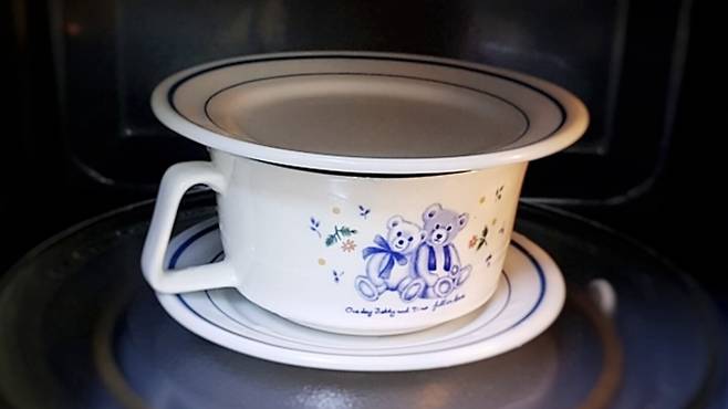 먼저 가열하기에 앞서 그냥 하면 물이 넘칠 수 있어요. 그래서 이때 반드시 위아래로 접시를 깔아 준비하는 것이 중요해요.