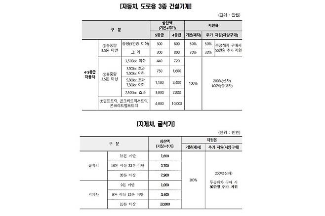 조기폐차 보조금 상한액은 4등급 차량 중 3.5톤 미만은 최대 800만 원, 3.5톤 이상 중 7,500cc 초과 차량은 최대 7,800만 원까지 지급된다. 5등급 차량과 건설기계 또한 상한액 내에서 보조금을 지원하며, 저소득층(생계형 차량)과 소상공인에게는 상한액 내에서 100만 원을 추가로 지급한다. 상한액 내에서는 조기폐차 보조금에 더해 폐차 후 신차를 구매하면 추가보조금을 받을 수 있다.