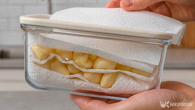 먼저 바닥에 설탕을 얇게 깔아 냉장고 내부 습도 변화를 완만하게 만들고, 그 위에 키친타월을 한 장 올려 마늘이 직접 닿지 않도록 한다. 이후 마늘을 한 겹 올리고 다시 키친타월을 덮어 냉장고 문을 열 때 들어오는 냉기를 완충한다.
