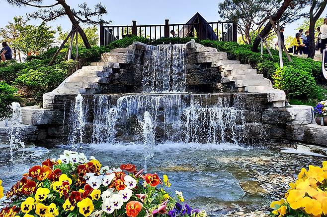 한쪽에는 물빛공원 폭포가 자리하고 있어 여름이면 시원한 물줄기 소리가 공간 전체를 채운다. 아이들을 위한 바닥분수는 작은 테마파크처럼 기능하며 가족 단위 방문객에게 인기다.