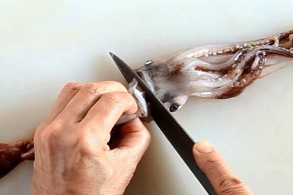 오징어 몸통과 다리를 분리하고, 내장과 눈, 이빨을 제거합니다.
