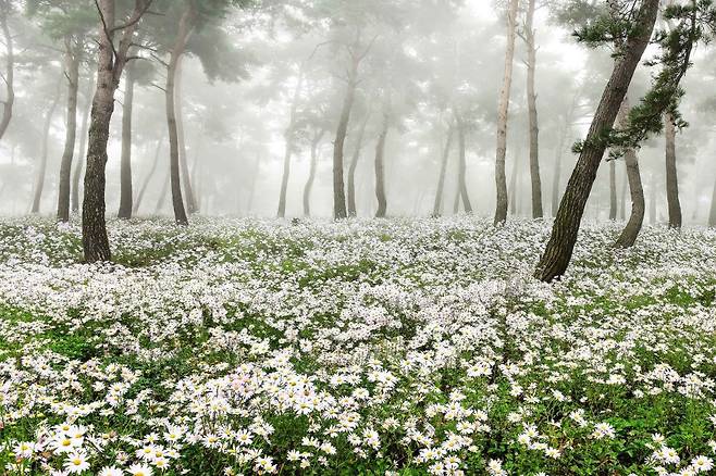 정읍 구절초 지방정원은 10월 초가 되면 솔숲에 만개한 구절초가 마치 가을에 내리는 눈을 형상화한 듯 운치 있는 모습이 매력적입니다. 이른 아침 방문한다면 옥정호의 물안개도 어우러져 한 폭의 수채화를 두 눈으로 확인할 수 있죠.