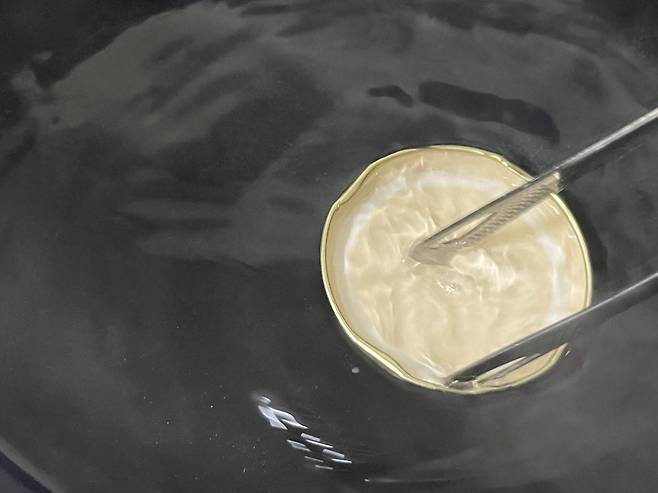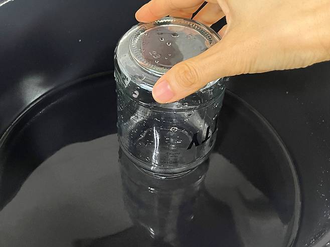 널찍한 냄비를 준비한 다음 물을 약간 받습니다. 유리병의 입구 정도만 잠겨도 충분해요. 그다음 유리병 입구를 아래로 향하게 뒤집어 냄비에 넣습니다.