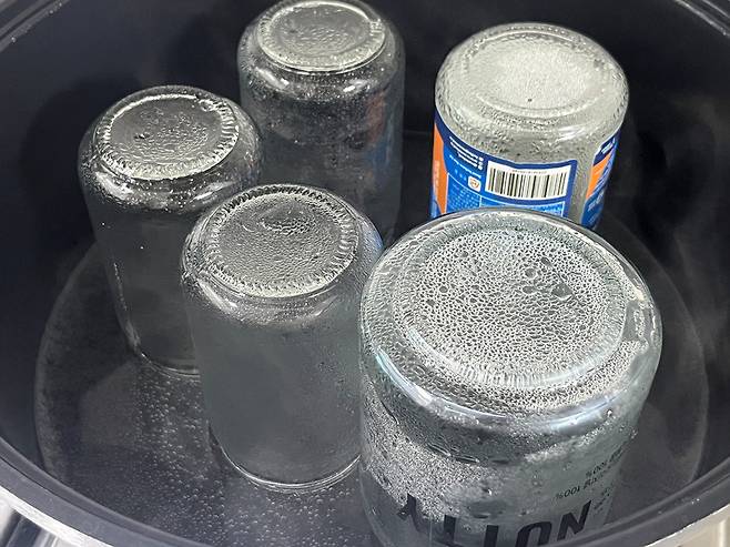 유리병뚜껑도 함께 소독하세요. 뚜껑을 같이 끓이지는 마시고, 유리병을 모두 꺼내고 난 다음 뚜껑만 넣어 뜨거운 물에 살짝 넣어 소독합니다.