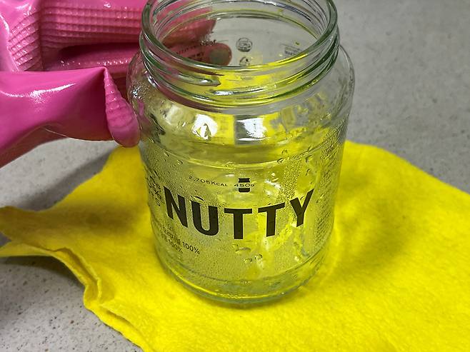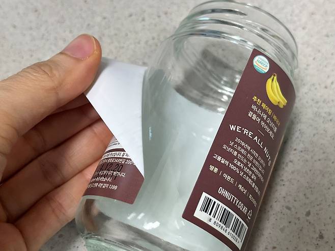 유리병에 붙어 있던 라벨은 깔끔하게 제거합니다. 만일 한 번에 제거가 안 된다면 물에 1~2시간 담가 놓은 후 떼어내세요.