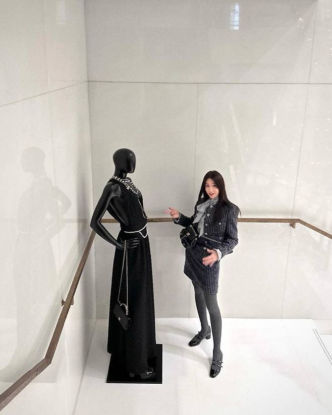 박하선은 세련된 그레이 톤의 트위드 재킷과 스커트를 매치해 가을과 잘 어울리는 스타일을 완성했습니다.