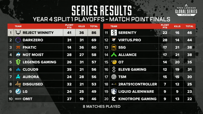 한국 선수들로 구성된 리젝트 위니티 팀이 에이펙스 레전드의 2024 시즌 프로 대회 첫 스플릿의 플레이오프의 가장 높은 곳에 올랐다.