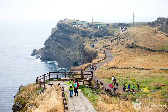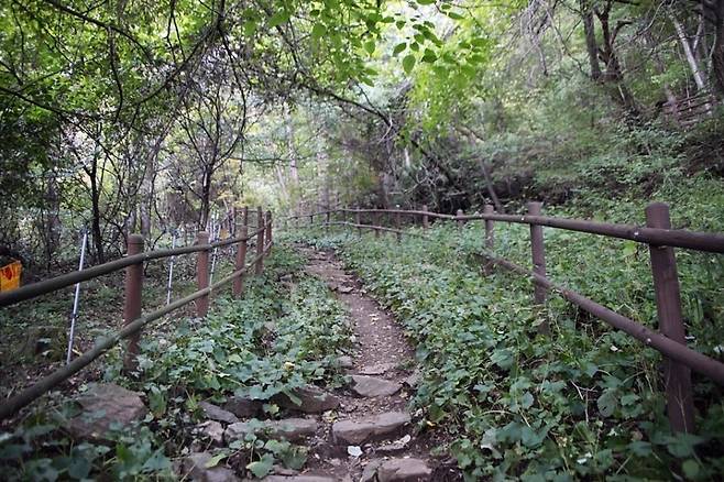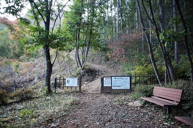 남근석공원을 지나면 경사진 흙길과 암반길이 번갈아 등장합니다. 산 중턱에는 멸종위기종 2급인 왕제비꽃 보호 구역이 있어 전기 울타리가 설치된 구간도 지나게 되지요. 산행 중간에는 목재데크가 설치된 구간도 있어 큰 어려움 없이 안전하게 걸을 수 있습니다.