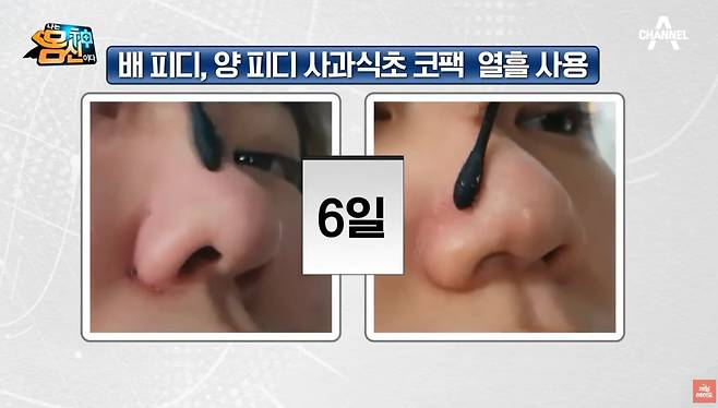 두 피디는 사과식초를 적신 화장솜으로 코팩을 한 뒤 면봉으로 피지를 제거하는 과정을 10일간 반복했다. 영상에는 코팩만 했는데도 피지가 뽑아져 나오는 장면이 관찰됐다. 쓱쓱 문지르기만 했는데도 피지가 면봉에 묻어 나왔다.