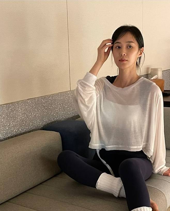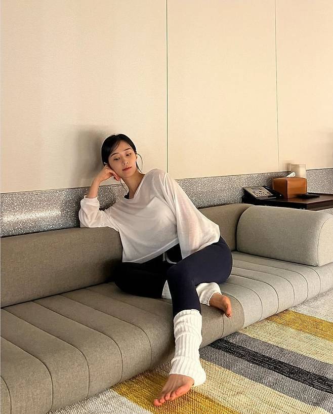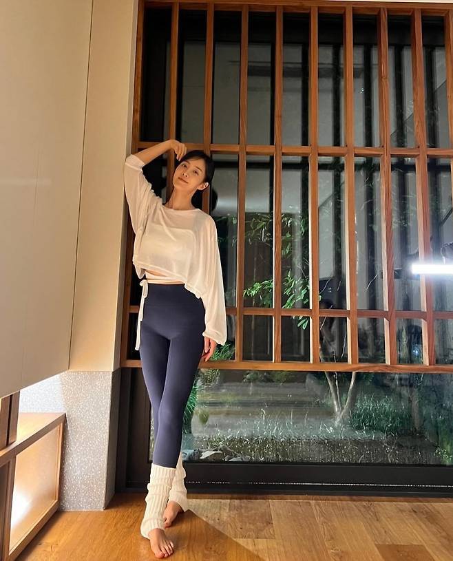 특히 요가복으로 보이는 슬림한 실루엣에도 불구하고 무심한 듯 여유로운 자세와 맨발의 연출이 현실감 있는 내추럴 매력을 자아내 눈길을 끌었습니다.
