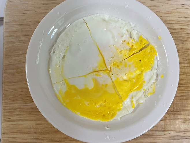전자레인지 조리 후 꺼냈더니 계란이 잘 익어있습니다. 겉은 완전히 익었고 안쪽은 반숙 형태입니다.