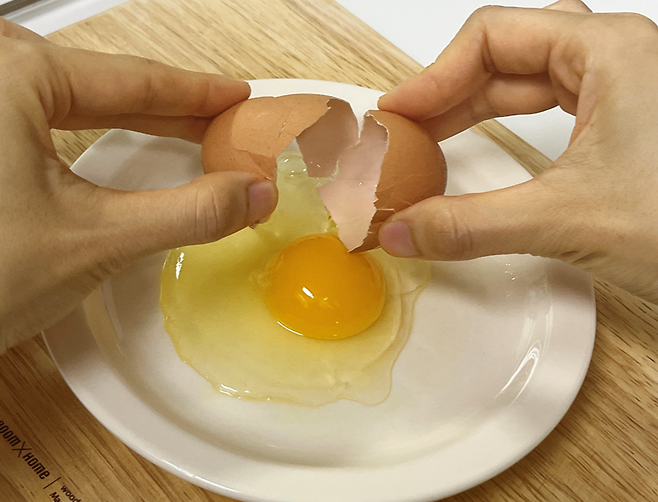 계란을 전자레인지에 조리할 때 가장 중요한 것, 바로 계란 노른자를 터뜨리는 것입니다. 포크 또는 젓가락으로 계란 노른자를 충분히 터트려줍니다.