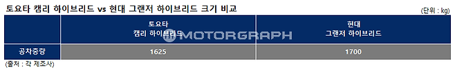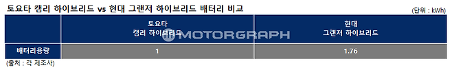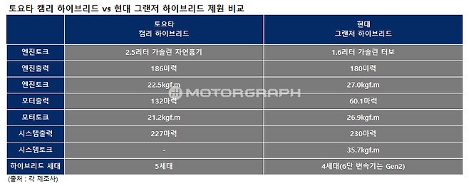 모터 성격도 비슷한데, 캠리가 그랜저보다 2배 이상 출력이 높지만 토크 부분은 그랜저가 더 앞서는 모습을 보였다. 시스템출력은 두 모델이 거의 같은 것을 확인할 수 있다.