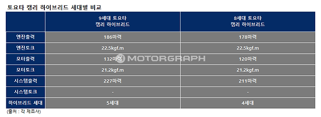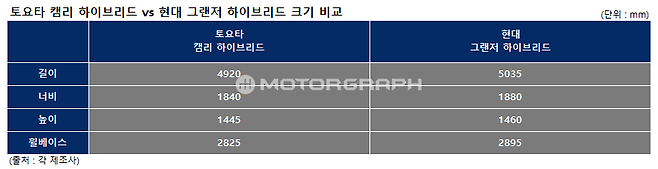 토요타가 출시한 9세대 캠리는 트림에 따라 4843만원부터 5403만원의 가격으로 출시됐다. 그랜저 하이브리드를 중간 트림인 익스클루시브만 선택해도 4824만원이고 몇가지 옵션을 추가하면 약 5천만원 정도로 올라가니 가격적으로 직접 비교가 될 수밖에 없다. 분명한 체급의 차이, 하지만 비슷한 가격. 신형 캠리는 그랜저를 상대로 선전할 수 있을까? 현재 기준으로 경쟁력은 어느정도일까? 꼼꼼하게 비교해봤다.