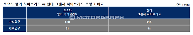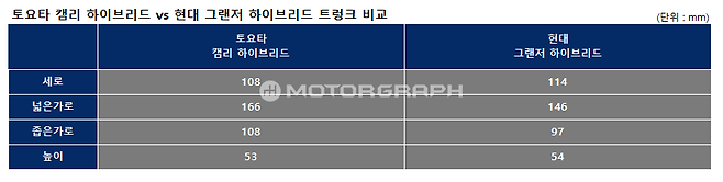 그랜저가 세로는 더 길었다. 그런데 가로 폭은 캠리가 더 넓었다. 좁은가로나 넓은가로 모두 넓었기 때문에 활용성 면에서 좋을 것 같다.