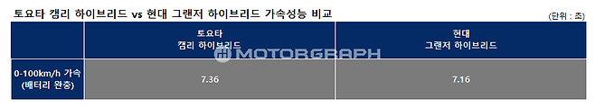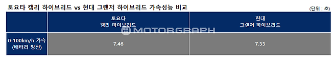 두 차량 모두 0.1초에서 0.2초 전후 느려진 가속 성능을 보여줬다. 토요타 하이브리드 시스템은 배터리 유지능력이 워낙 좋기 때문에 사실상 큰 차이가 만들어지지 않았다.