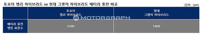 캠리가 엔진회전수를 더 낮게 쓰는 것을 볼 수 있다. 엔진 배기량이 크다는 것은 그만큼 저회전 토크가 더 강하다는 뜻이다. 덕분에 엔진회전수를 조금 더 낮춰도 배터리를 충전 할 수 있는 힘이 발휘되는 것이다. 그만큼 소음과 진동을 낮추는데 유리하다.