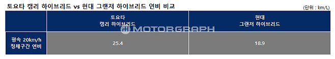 우선 캠리와 그랜저 모두 가다서다 하는 정도는 전기모터만으로 통과했고, 이때 트립 컴퓨터의 연비는 리터당 99.9를 보여줬다. 시간이 지나면서 조금씩 엔진이 개입하기 시작했고, 엔진이 조금 더 늦게 개입하고 작동하는 시간이 짧았던 캠리가 이처럼 높은 연비를 기록할 수 있었다.
