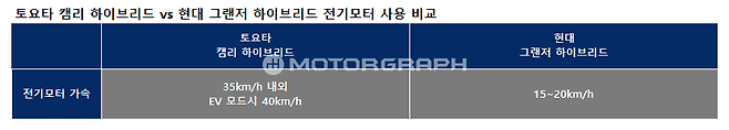 정지상태에서 모터만으로 가속할 수 있는 속도는 캠리 쪽이 더 높았다. EV 모드로 설정하면 시속 40km까지는 전기모터 만으로 가속할 수 있기 때문에 시내주행때 조금 더 전기차처럼 쓸 수 있다는 장점이 있다.