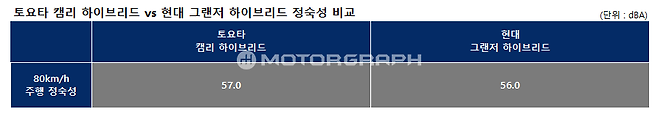 결과는 그랜저가 더 조용한 모습을 보였다. 실제로 엔진이 작동하는 소리를 들어보면 캠리는 중저음 쪽이고 그랜저는 그보다 고음대 음색을 만들어낸다. 하지만 엔진회전수나 음색과 무관하게 그랜저의 좋은 흡차음 성능이 이 차이를 무시하고 더 조용한 결과를 만들어냈다.