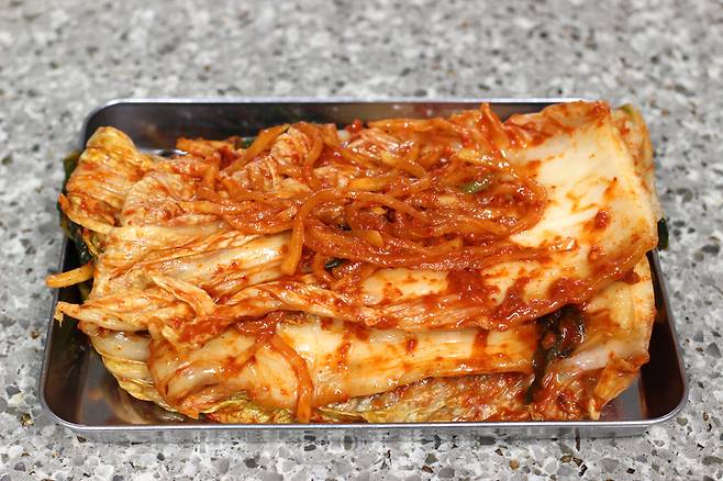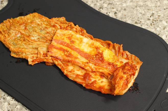 배추김치는 넓은 겉잎으로 8~9장 정도 준비해요. 고기를 돌돌 말아야 하기 때문에 가운데 작은 잎사귀 말고 이파리가 넓은 겉잎으로만 엄선해주세요.