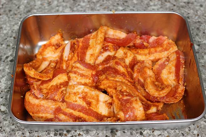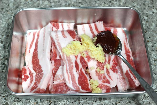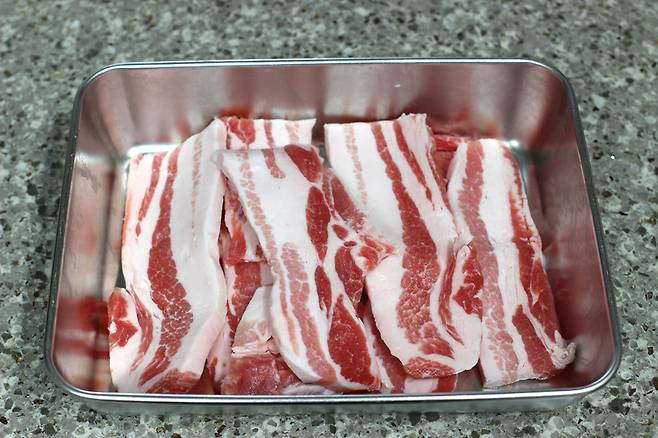 삼겹살은 반으로 썰어요. 뼈가 있다면 제거해주면 좋겠지요~