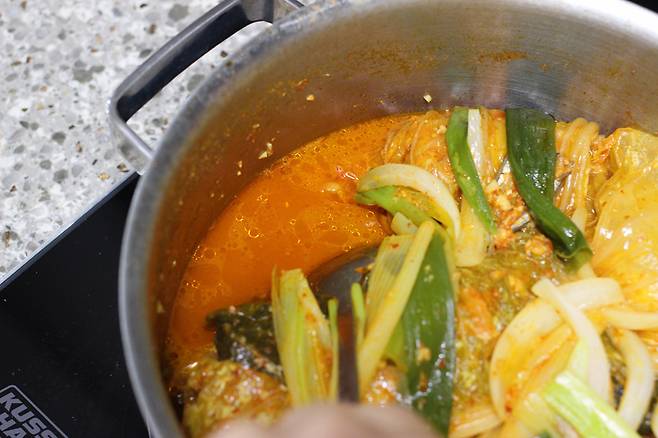 썰어둔 대파도 넣었어요. 이제 국물이 자작해질 때까지 끓이면 돼요.