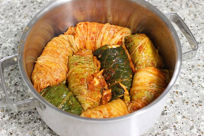 하나씩 정성스럽게 말아서 냄비에 넣어요. 이렇게 딱 맞아게 되야 끓이면서 풀어지지 않는답니다. 남는 공간이 없도록 꽉 채워질 수 있게 냄비를 골라야 해요.