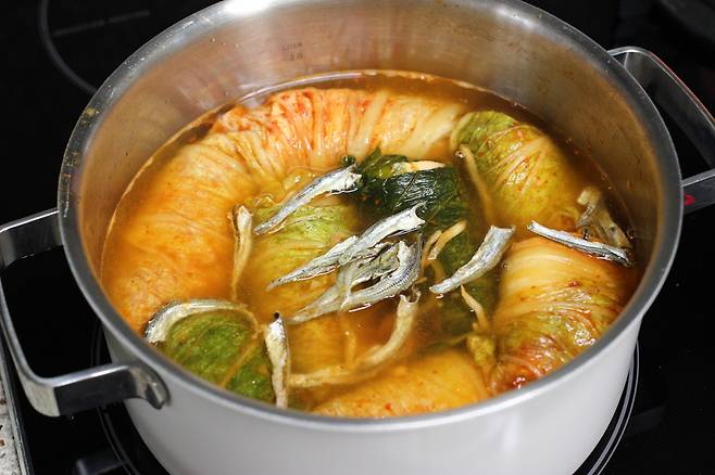 이제 잠길 정도로 물을 붓고 강불로 켜요. 국물용 멸치 8~9마리 정도 대가리와 내장을 제거한 뒤에 같이 넣어줍니다.