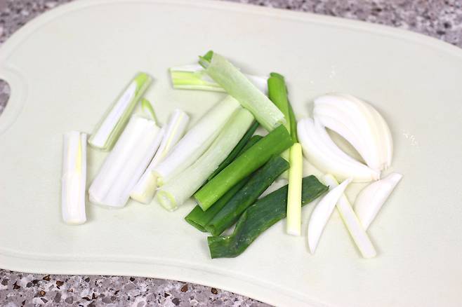 끓는 동안 대파를 다듬어서 썰어요. 반으로 갈라 길게 썰면 식감이 좋아요. 저는 자투리 양파가 있길래 조금 썰어 넣었어요.