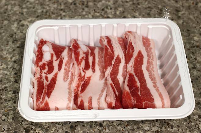 삼겹살 500g 준비했어요. 기름이 많은 것이 싫다면 얇고 길게 썬 앞다리살을 이용해도 좋아요.