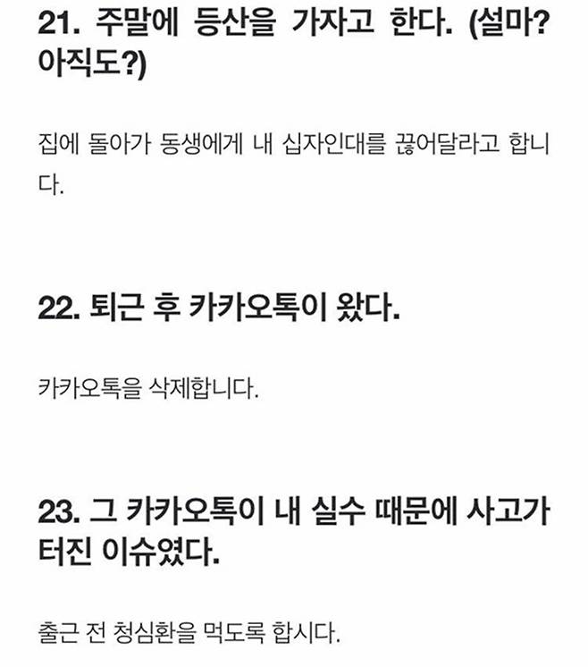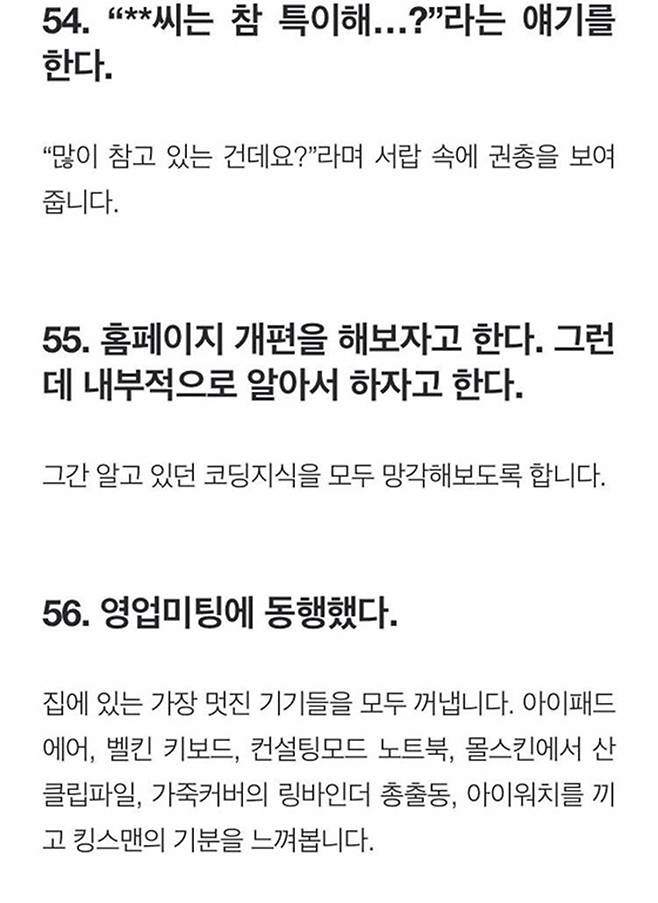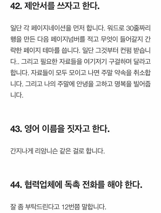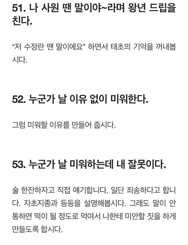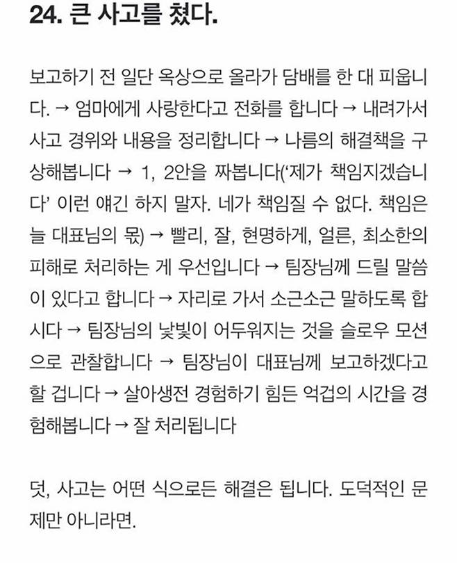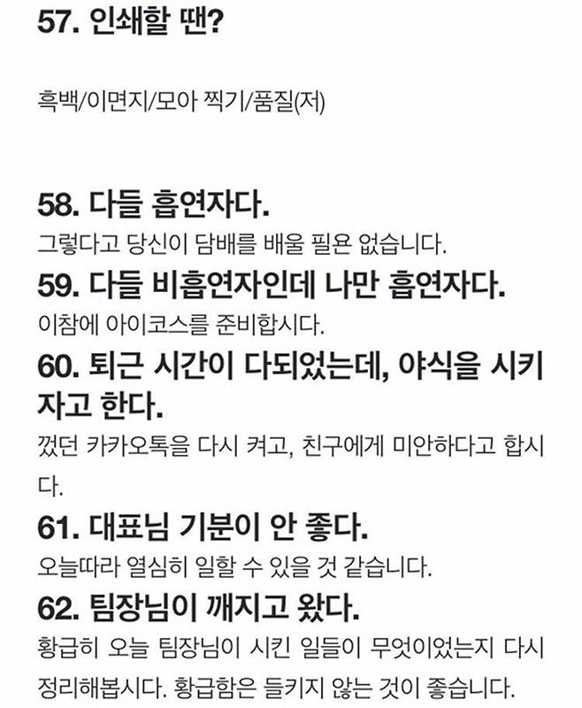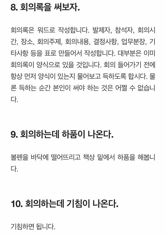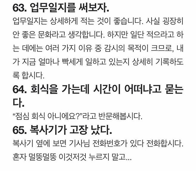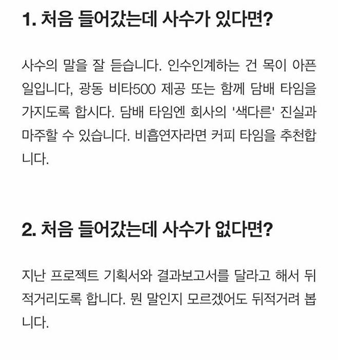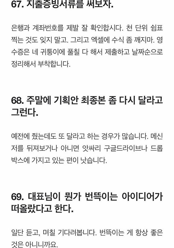 어쨌든, 한 커뮤니티에 공유된 신입사원을 위한 회사 생활 꿀팁이 화제가 되었다. 읽어보고 회사생활 적응하는 데 잘 활용하길 바란다.