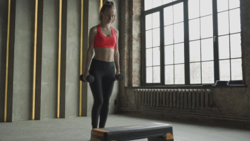 적당한 무게의 아령을 손에 쥔 상태에서 스텝박스 앞에 서서 시작합니다. 먼저 오른발을 스텝박스에 올리고, 그 후 왼발을 올려 스텝박스 위에 올라섭니다. 그다음, 오른발을 먼저 내리고 왼발을 내려 시작 자세로 돌아옵니다. 발을 바꿔가며 반복합니다.