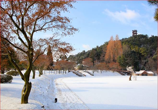 오리숲길 안쪽으로 들어서면 말티고개의 열두 굽이 길을 모티브로 만든 산책로가 이어집니다. 낮은 동산에는 데크길이 놓여 있어 가벼운 오르내림을 즐길 수 있으며, 겨울에는 나뭇잎이 사라져 길의 곡선과 동선이 더욱 선명하게 드러납니다.