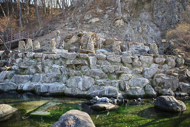 겨울철에는 용미리 폭포의 물줄기가 멈춰 있지만, 인공적으로 조성된 폭포 뒤편의 암벽은 오랜 세월 이 자리를 지켜온 자연 그대로의 모습입니다. 물이 흐르지 않아도 겨울 특유의 고요함이 공간의 분위기를 단단하게 잡아줍니다.