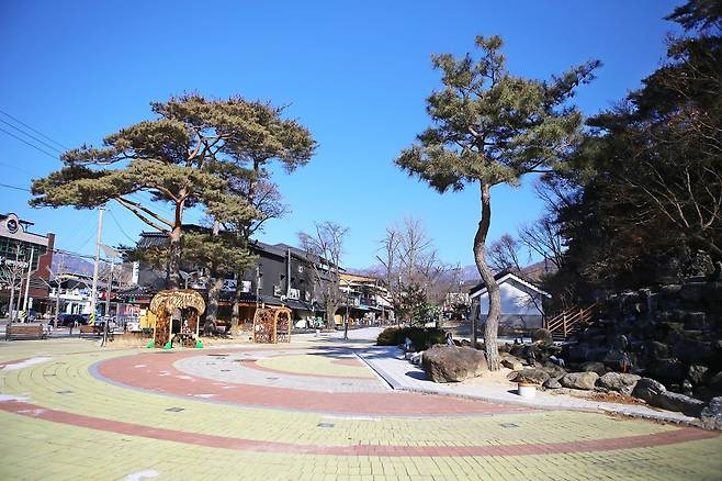 규모는 크지 않지만, 짧은 산책을 즐기기에는 알맞은 공간입니다. 초입에는 사내리 숙박업의 원조로 알려진 새터주막의 흔적을 알리는 설치물이 자리하고 있습니다. 조선시대 지리지에도 기록이 남아 있을 만큼 오래된 주막으로, 과거 속리산을 오가던 사람들의 쉼터였습니다. 작은 광장과 벤치, 화장실, 조형물이 함께 조성돼 있어 겨울에도 잠시 머물며 쉬어가기 좋습니다.