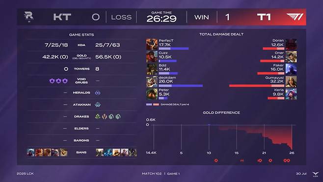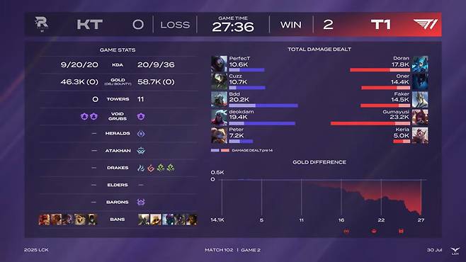 KT의 희망은 오래가지 못했다. T1은 17분 탑 타워 교전에서 빅토르를 잡아내는 데 성공했다. 18분 기준, T1은 드래곤 3스택과 5천 골드 리드를 잡았다. T1에게 패배할 각이 보이지 않았다. T1은 KT의 산발적인 교전을 물리치고 30분 전에 2세트를 마무리했다. KT 입장에서는 강팀과의 격차를 실감할만한 경기였다.