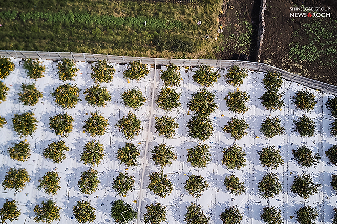 과수원에 들어서자 일반 노지에서는 볼 수 없던 풍경이 펼쳐진다. 마치 감귤밭에 눈이 내린 듯한 모습이다. 밭을 덮은 새하얀 천에 반사된 빛에 감귤 열매가 주황빛으로 영롱하게 빛났다. 천의 정체는 ‘타이벡’이다. 나석우 농가는 이를 활용한 농법으로 감귤을 생산하고 있다.