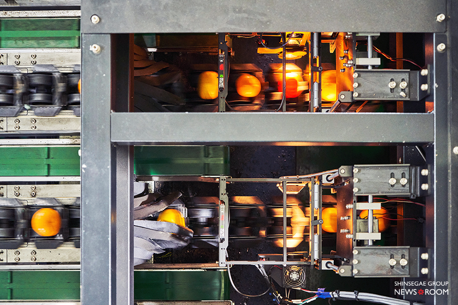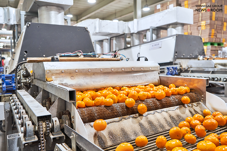 중문농협에서는 13Brix 이상의 고당도 감귤만을 선별하는 신세계백화점 전용 선별장을 별도 운영하고 있다. 이곳에서 모인 감귤은 불순물, 먼지 등을 제거하는 세척 및 건조의 과정을 거친다. 깨끗하게 씻긴 감귤들을 작업자들이 육안으로 한번 더 꼼꼼하게 검수한다.