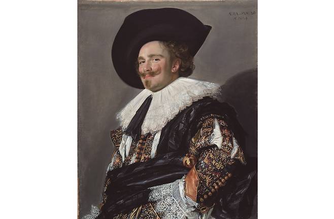 그의 그림 속 인물들은 한결같이 낙천적이다. 이 그림도 마찬가지다. 제목처럼 그림 속 남자는 웃고 있다. 그런데 엷은 웃음기를 띤 얼굴을 다시 보면 자신감이 넘쳐흘러 도도한 인상으로 다가온다. 꽉 다문 입, 카이저수염, 몸을 약간 옆으로 비튼 자세에서 정면을 응시하는 시선, 챙이 크고 넓은 모자와 함께 흑백의 강렬한 대비에 더해 섬세하게 수놓은 레이스 카라와 소매 끝 밑동인 커티스, 섬세하고 복잡하고 호사스러운 소매 장식의 영향 때문일 것이다. 할스 이전에 네덜란드에서 이런 식으로 초상화를 그린 화가는 없었다.