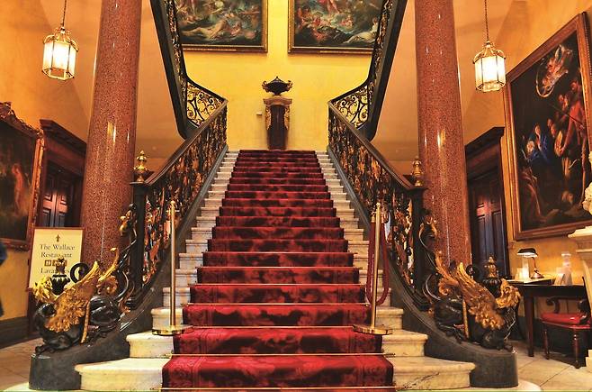 약 250년 전에 런던 중심부 맨체스터 광장에 들어선 하트퍼드 하우스는 3층 규모의 단아하고 정갈하면서도 귀족이 살았던 저택의 품격이 느껴지는 우아한 인상이 매력적인 미술관이다. 1층 프런트 홀에서 2층으로 올라가는 대리석 계단에 깔린 화려한 레드카펫과 황금 조각상으로 장식된 눈부신 난간, 난간 바깥 양쪽으로 수호신처럼 우뚝 솟은 진갈색 대리석 기둥에 더해 좌우 벽과 정면 벽에 걸린 대형 그림들을 보노라면 눈이 호사를 누리는 기분에 우쭐해진다.