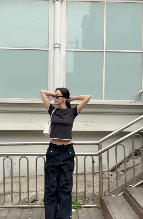 이주연 님이 착용한 상의는 블랙 컬러의 크롭티였는데요. 소매 끝과 밑단에 흰색 레이스가 더해진 디자인으로 아주 감각적인 디테일을 보여줬어요. 크롭 기장이기 때문에 허리라인이 살짝 드러나며 전체적인 실루엣이 길어 보이는 효과도 있었죠.