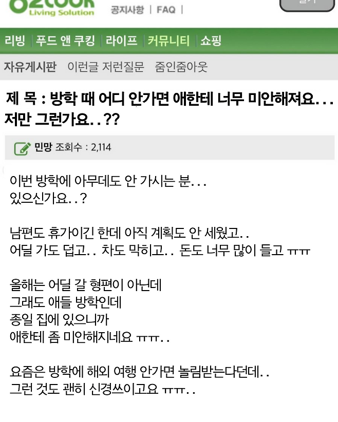 맘카페서 반응 폭발.. "방학에 놀러 안 가면 아이한테 넘 미안해요ㅠㅠ"
