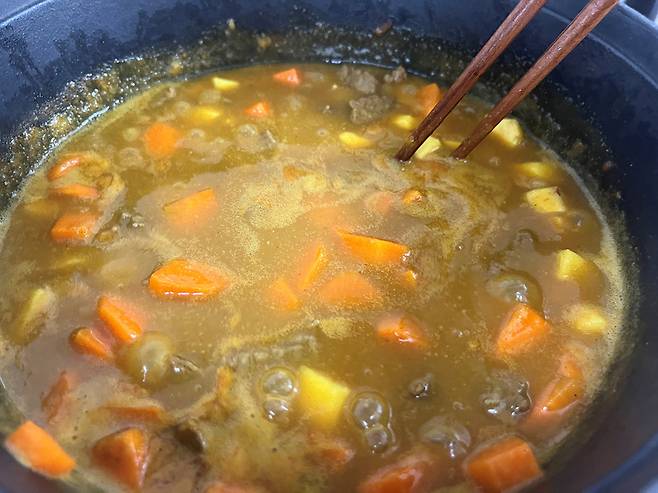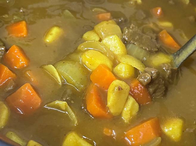카레의 농도와 간을 확인하시고, 야채가 부드럽게 익었으면 불을 끄세요. 카레는 시간 지나면 살짝 걸쭉해지기 때문에 너무 되직하게 끓이실 필요는 없어요.
