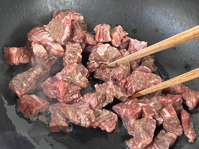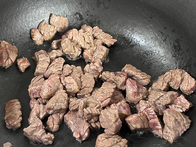 적당한 크기로 썬 고기는 식용유 살짝 넣고 약불에서 먼저 볶아 주세요. 고기는 소고기 부드러운 부위 아무거나 쓰셔도 됩니다. 간 고기로 만드셔도 편하고요.