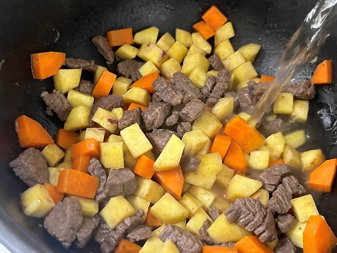 카레가루 자체가 간이 되어있긴 하지만, 재료 볶을 때 밑간을 하면 훨씬 맛있습니다. 소고기도 살짝 볶고 나서 소금, 후추 소량 넣어 간을 해주세요.